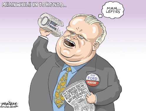 Rob Ford is human, yes, and makes mistakes, yes, but it is not easily forgiven when a person in power-one who reminds us: “I’m Rob Fucking Ford, the Mayor of This City”- takes a hissy fit after being publicly humiliated and then takes it out on the very people he is supposed to be supporting. So perhaps when Ford, after his 2011 911 calls, decides to close homeless shelters, evict tenting occupiers who have the right to protest, uses fake twitter accounts to deceive voters, attempts to close libraries, cuts social finding for single mothers, cuts grants to community-led organizations, cuts daycare funding, closes pools and rinks, cuts AIDS funding, and dismisses anyone who protests his mayoring as “the same 500 people” that show up for every demonstration, we might all start paying attention to how this man reacts to personal humiliation.